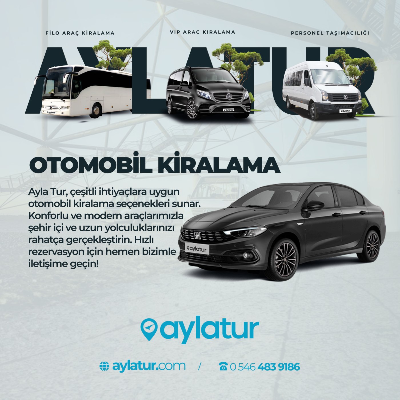 AYLATUR araç kiralama hizmeti ile, özgürlüğünüzü ve konforunuzu artırarak, seyahat deneyiminizi en üst düzeye çıkarabilirsiniz. Güvenilir, esnek ve profesyonel bir hizmet için bizimle iletişime geçin ve yolculuklarınızı daha keyifli hale getirin.