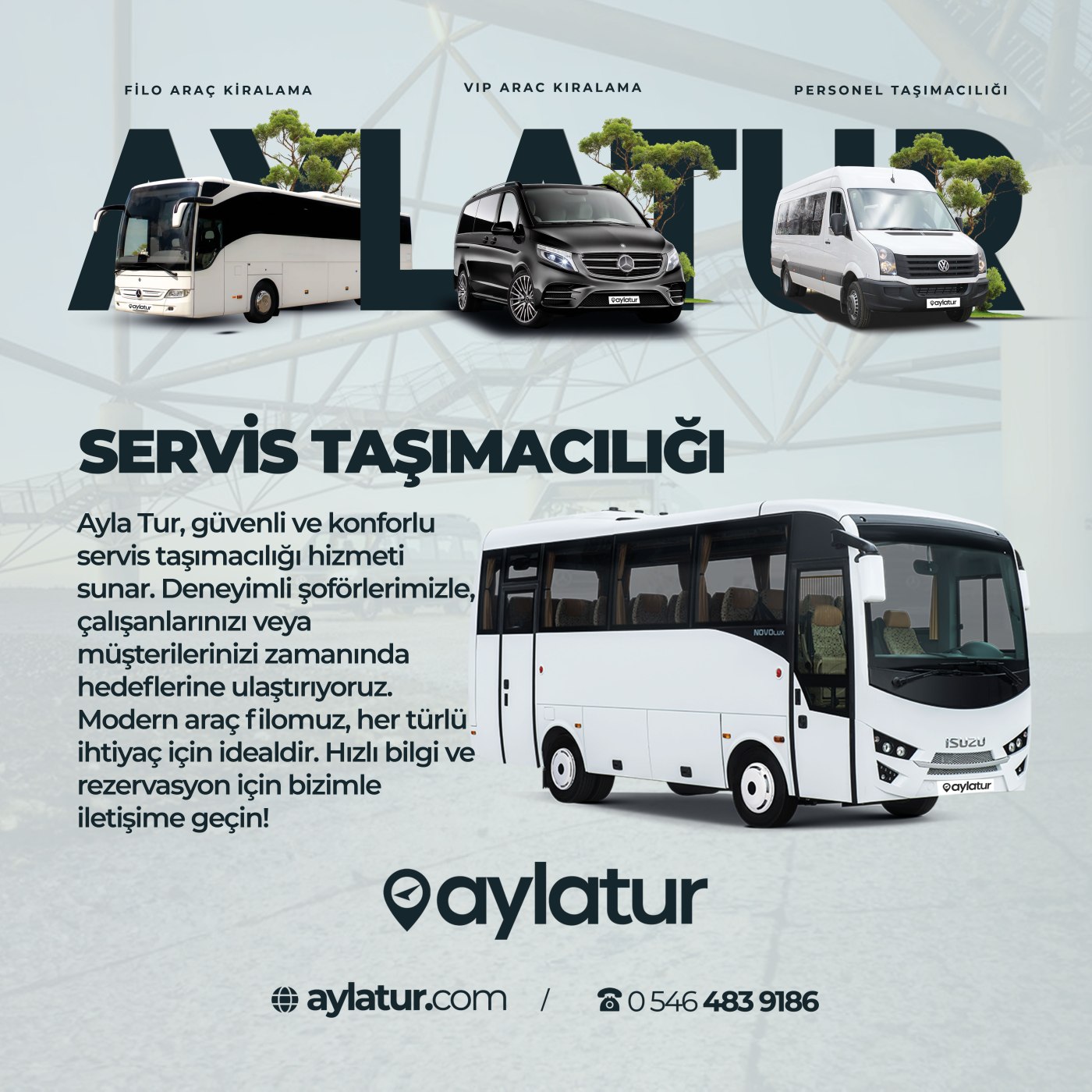 AYLATUR, kurumsal ve bireysel müşterilerine servis taşımacılığı alanında güvenilir ve kaliteli bir hizmet sunmaktadır. Müşterilerimizin ulaşım ihtiyaçlarını karşılamak için geniş bir filoya sahip olan AYLATUR, şehir içi ve şehirlerarası servis taşımacılığı konusunda uzmanlaşmıştır.