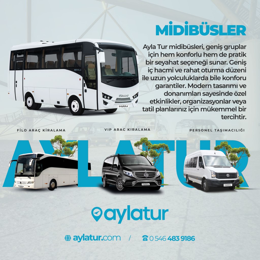 Ayla Tur midibüsleri, geniş gruplar için hem konforlu hem de pratik bir seyahat seçeneği sunar. Geniş iç hacmi ve rahat oturma düzeni ile uzun yolculuklarda bile konforu garantiler. Modern tasarımı ve donanımları sayesinde özel etkinlikler, organizasyonlar veya tatil planlarınız için mükemmel bir tercihtir.