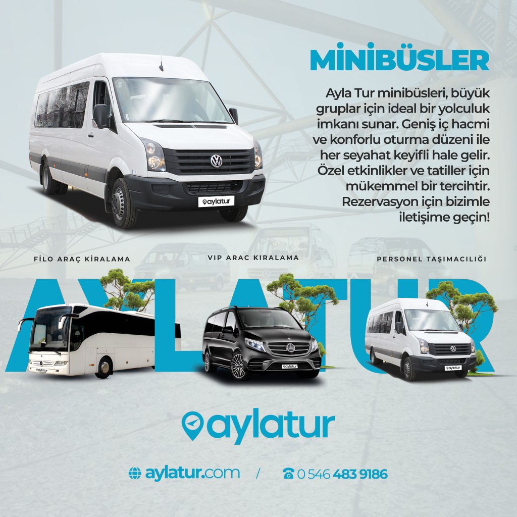 Ayla Tur minibüsleri, geniş gruplar için mükemmel bir yolculuk imkanı sunar. Ferah iç hacmi ve konforlu oturma düzeni, her yolculuğunuzun keyifli geçmesini sağlar. Modern özellikleriyle donatılmış olan minibüslerimiz, hem özel etkinliklerde hem de tatil planlarınızda rahatlıkla kullanılabilir.